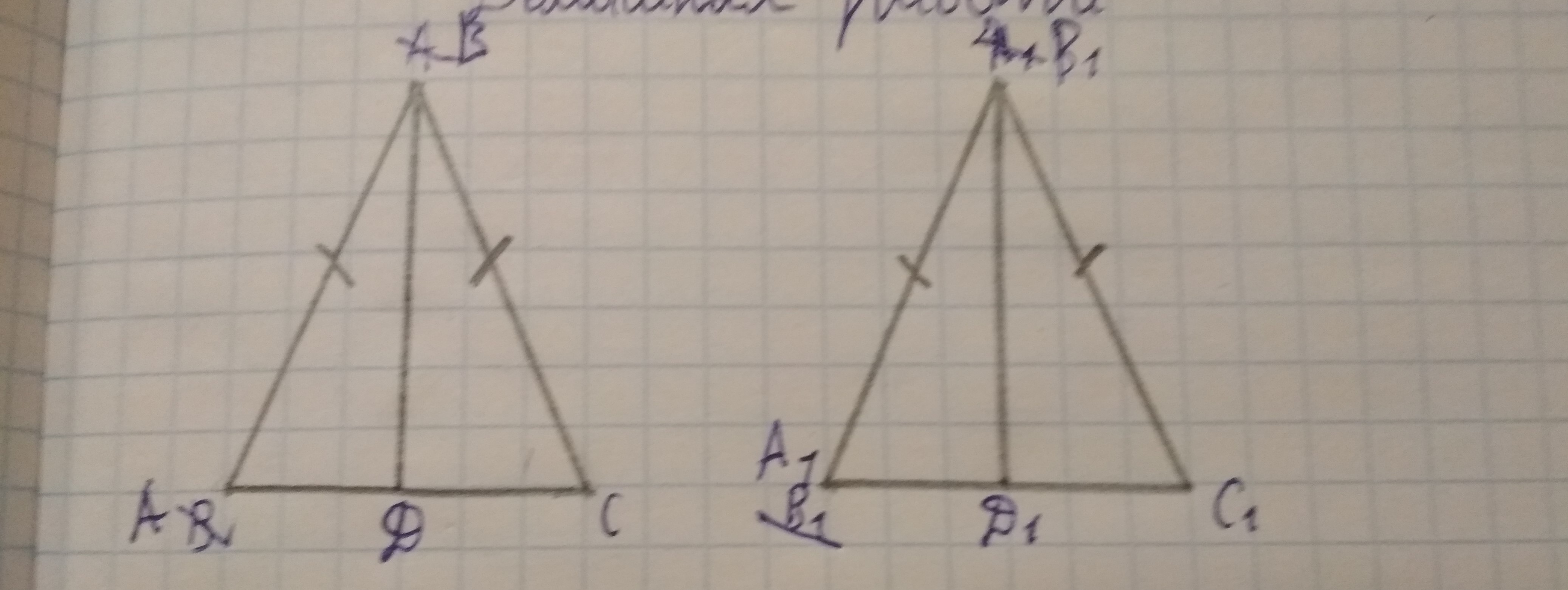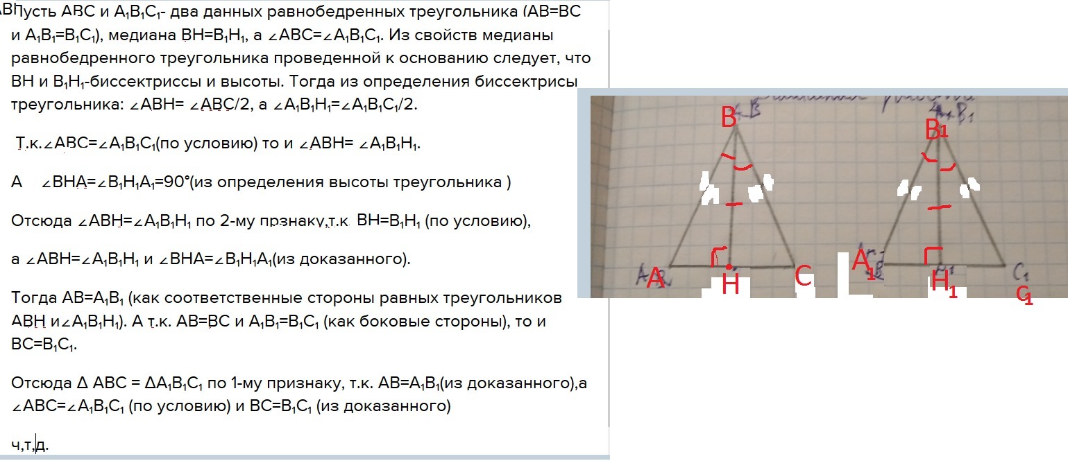 Докажите, что 2 равнобедреных треугольника ABC и A1B1C1, у которых медиана (которая равна медиане тр-ка A1B1C1), проведённая к основанию,