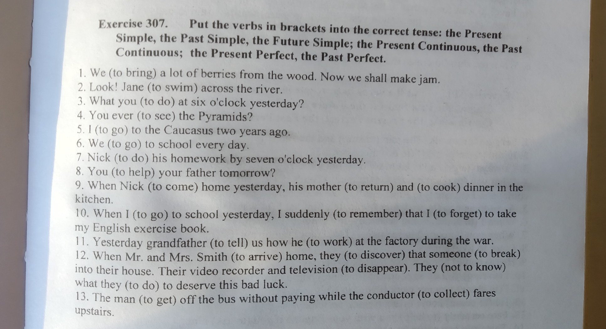 1) brought 2)is swimming 3)did you do 4)have you ever seen 5)went 6)go