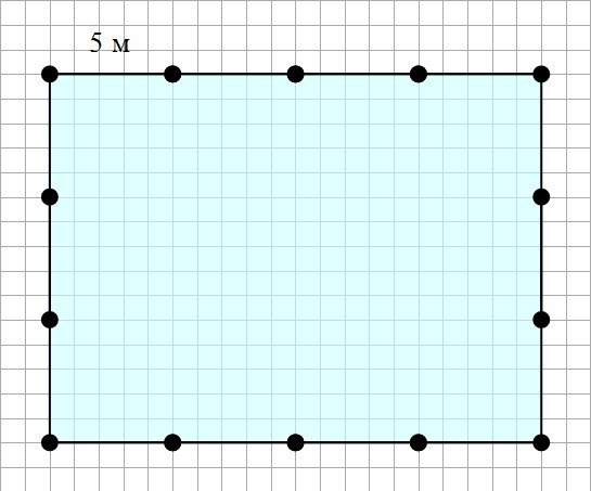 Так как участок имеет прямоугольную форму, то первый и последний столбы в заборе совпадают. Поэтому для ограничения 14 промежутков по 5 м потребуется 14 столбов: 5 по горизонтали и 4 по вертикали участка. (См. рис.)