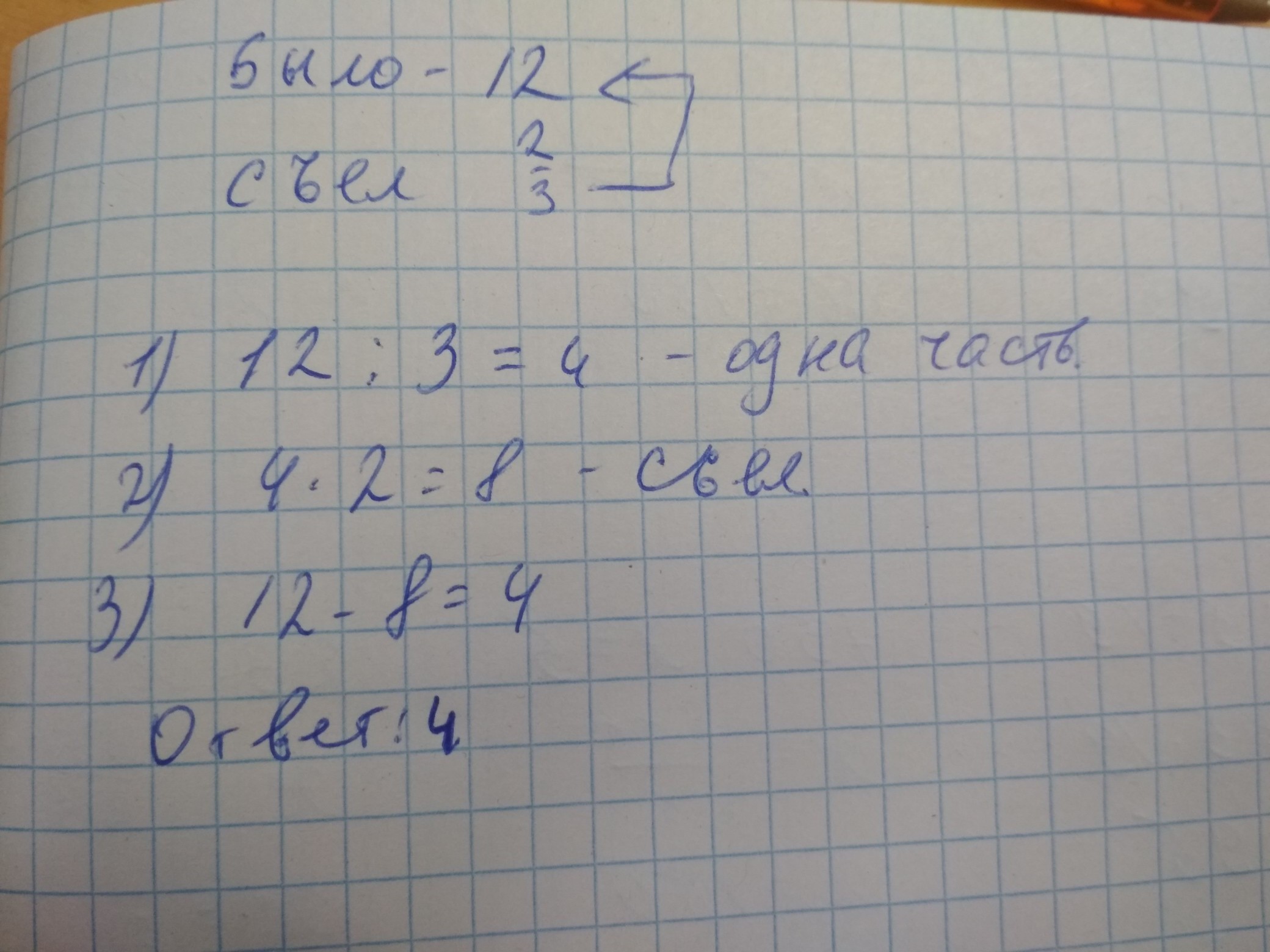У Кайрата было 12 сладостей 2/3 из них он съел.Сколько сладостей осталось у Кайрата?Можно краткую запись и решения