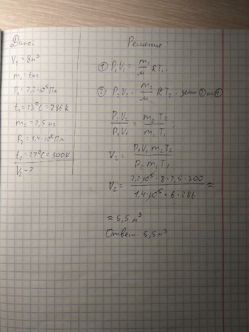 Уравнение Менделеева-Клапейрона для обоих случаев. Нам неизвестна молярная масса газа, поэтому мы делим оба выражения друг на друга.