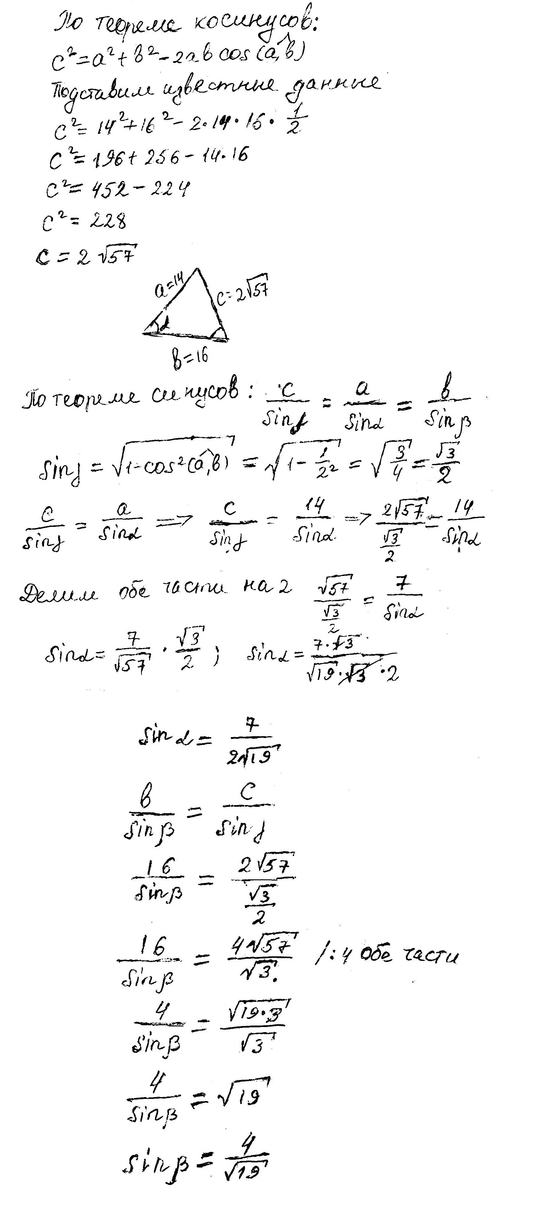в треугольнике две стороны равны 14см и 16см а косинус между ними 1/2 найдите третью сторону и синусы двух других углов