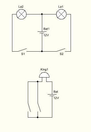 Нарисуйте схему соединения батарейки, двух лампочек и двух ключей, в которой каждая из лампочек включается и выключается независимо друг от друга