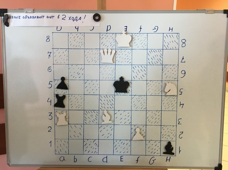 Сначала срубаем чёрную ладью на А4 . Королю некуда деваться и он идёт на F5. И ферзём ходим на D5.