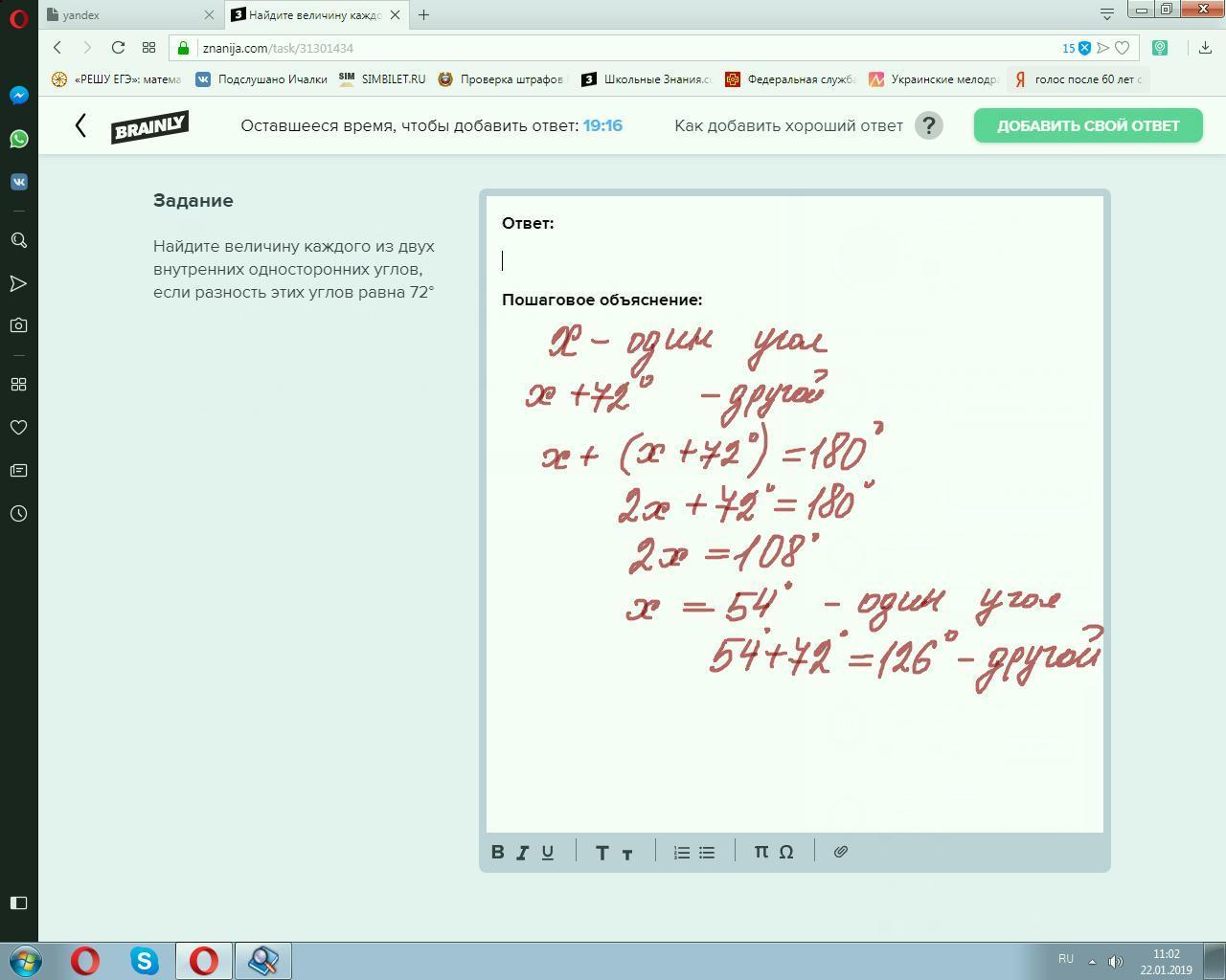 Найдите величину каждого из двух внутренних односторонних углов, если разность этих углов равна 72°