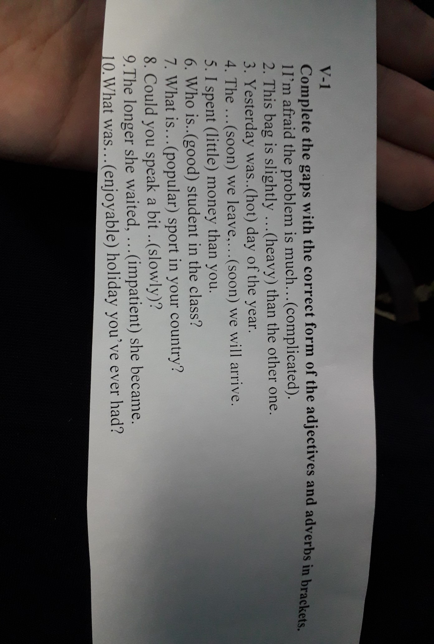 1. more complicated 2. heavier 3. the hottest 4. sooner 5. less 6. the best 7. the most popular 8. more slowly 9. more impatient 10. the most enjoyable