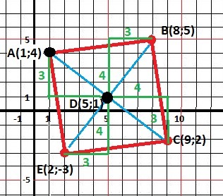 Вычисляем координаты вершин используя точку D(5;1) и всего два числа: 3 и 4.