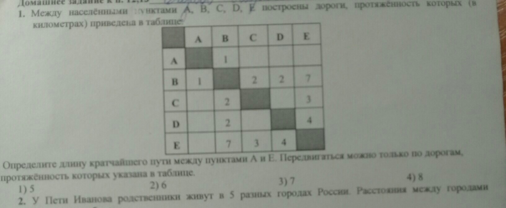 Между начелёнными пунктами A, B, C, D, E построены дороги, протяжённость которых (в кмлометрах) приведена в таблице.