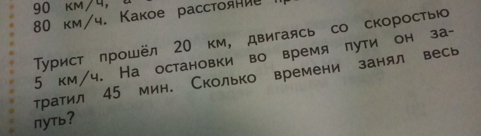 Чтобы найти время , нужно расстояние поделить на скорость- это формула. То есть мы 20:5=4- это время в пути. НО! У нас еще время на остановки. Мы еще прибавляем 45. ОТВЕТ: 4 часа 45 минут.