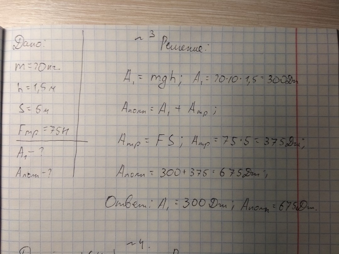 На полу стоит ящик массой 20 кг. Какую работу надо произвести, чтобы поднять ящик на высоту кузова автомашины, равную 1,5 м? Определите значение суммарной работы, произведенной при подъеме ящика и равномерном перемещении его по полу кузова на 5м, если сила трения при этом была равна 75 Н.
