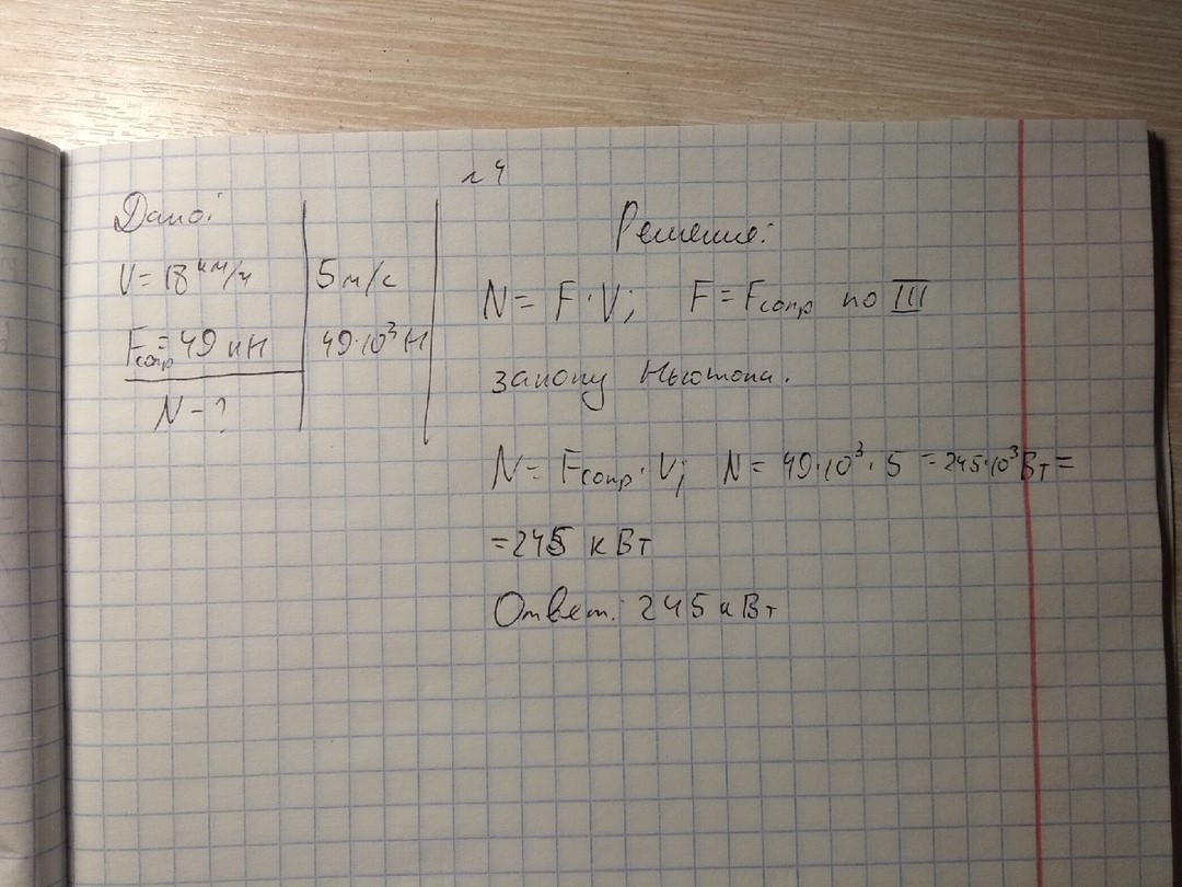 Определите мощность, развиваемую двигателем трактора, который при скорости движения18км/ч преодолевает силу сопротивления 49кН.