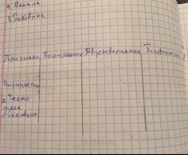 Брюхоногии: а) голова , нога ,туловище б)спиральная. Двустворчатые:а)туловище,нога ,головы нетредуцировона б)состоит из двух створок.Головоногие:а)туловище,голова,нога видоизменёная в сифон б)у большинства отсутствует
