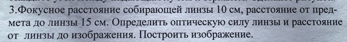 Фокусное расстояние собирающей линзы равно 10 см, расстояние от предмета до линзы 15 см. Определить оптическую силу линзы до изображения. Построить изображение