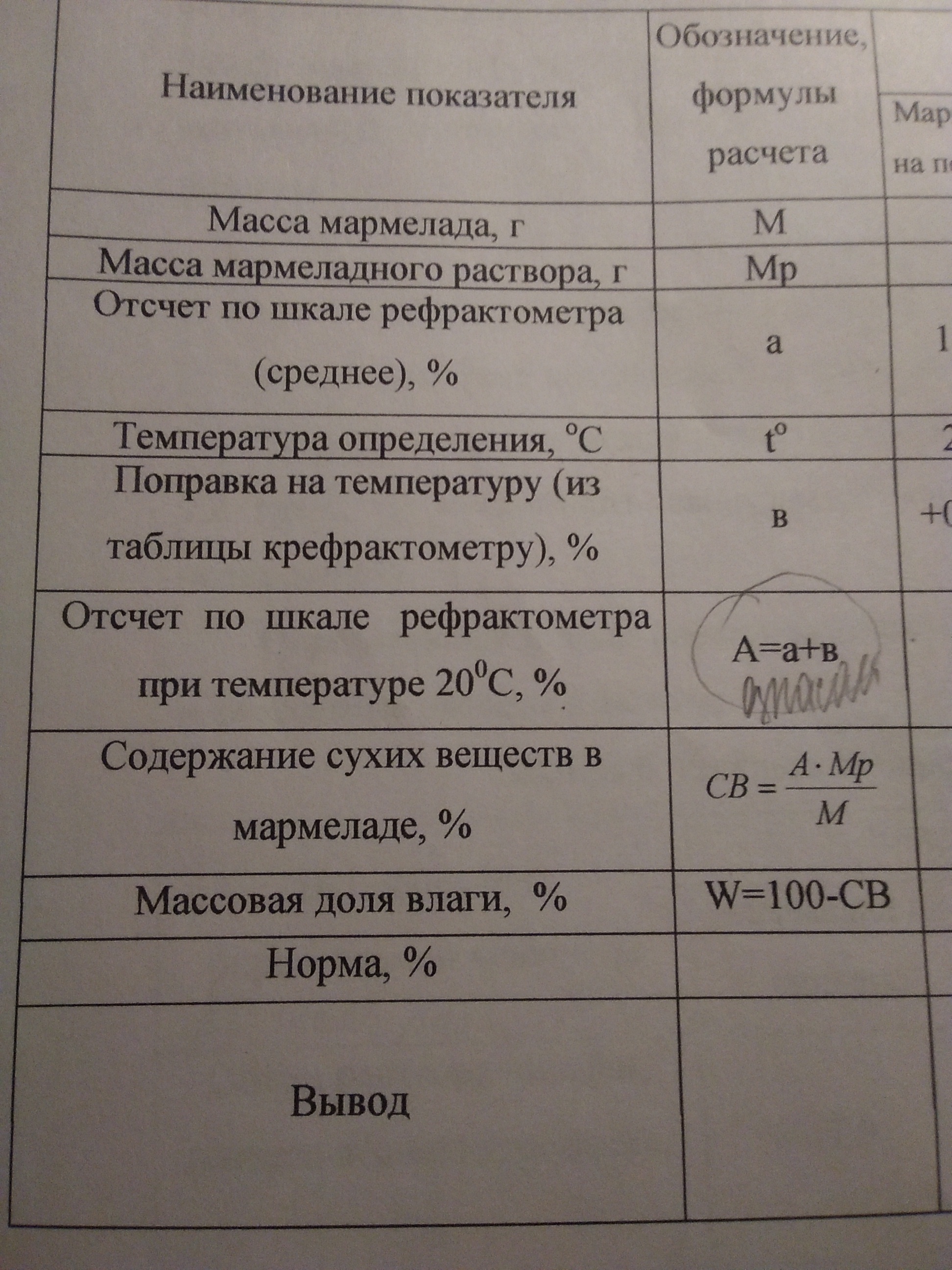 в - поправка на массовую долю мармелада в мармеладном растворе к температуре 20°С