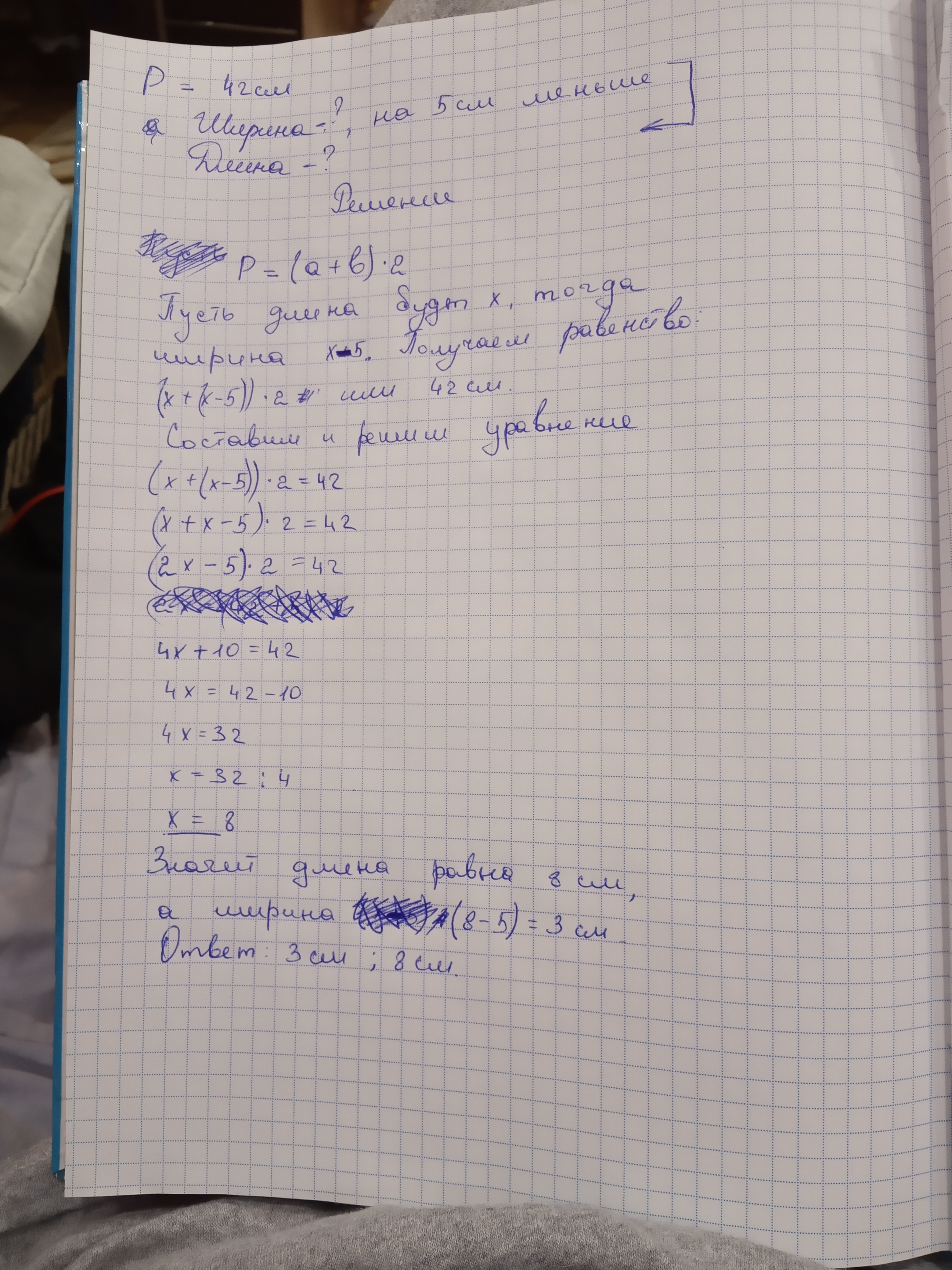 Периметр прямоугольника 42 см. Ширина на 5 см меньше длины. Найдите длину и ширину прямоугольника.
