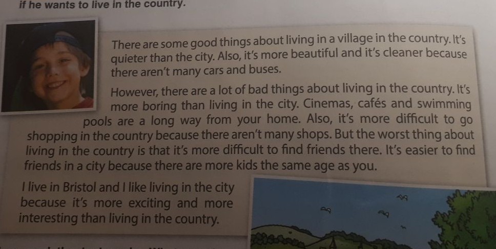 Однако есть плохие вещи проживания в деревне. Жизнь здесь скучнее, чем в городе. Кинотеатры, кафе и бассейны находятся далеко от твоего дома. Еще сложнее ходить по магазинам в деревне, потому что их тут немного. Но наихудшая вещь проживания в деревне это то, что тут сложнее найти друзей. Легче найти друзей в городе, потому что там больше детей такого же возраста как и ты.
