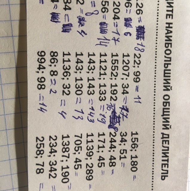 1136;32 =16, 156; 180 =4, 34; 51 =17, 244; 48 =4, 171; 45 =9, 705; 45 =15, 234; 342 =9, 258; 78 =2...надо раскладывать на множители и брать общие,. например 8=2*2*2 .24=2*2*2*3, НОД=2*2*2=8