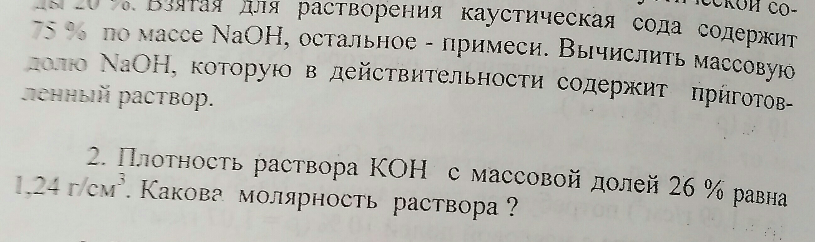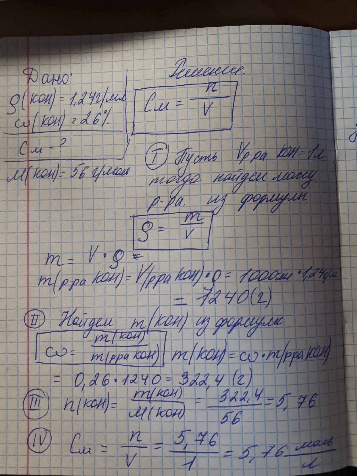 Плотность раствора КОН с (массовой долей 26%) равна 1,24 г/мл. Определить молярность этого раствора