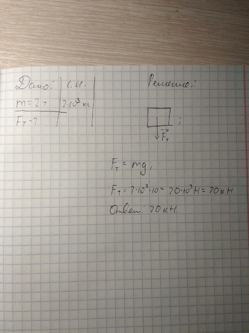 "Чему равна сила тяжести, действующая на тело массой 2 тонны? Изобразите силу графически "