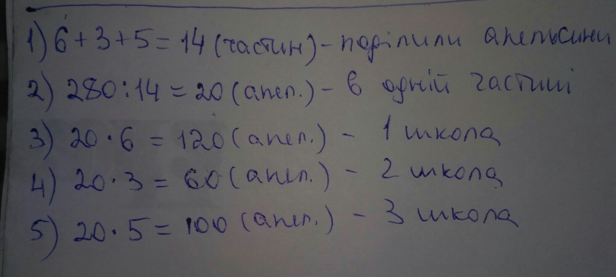 Між трьома школами розподілили 280 кг апельсин у відношені 6:3:5. Скільки кг апельсинів одержала кожна школа?