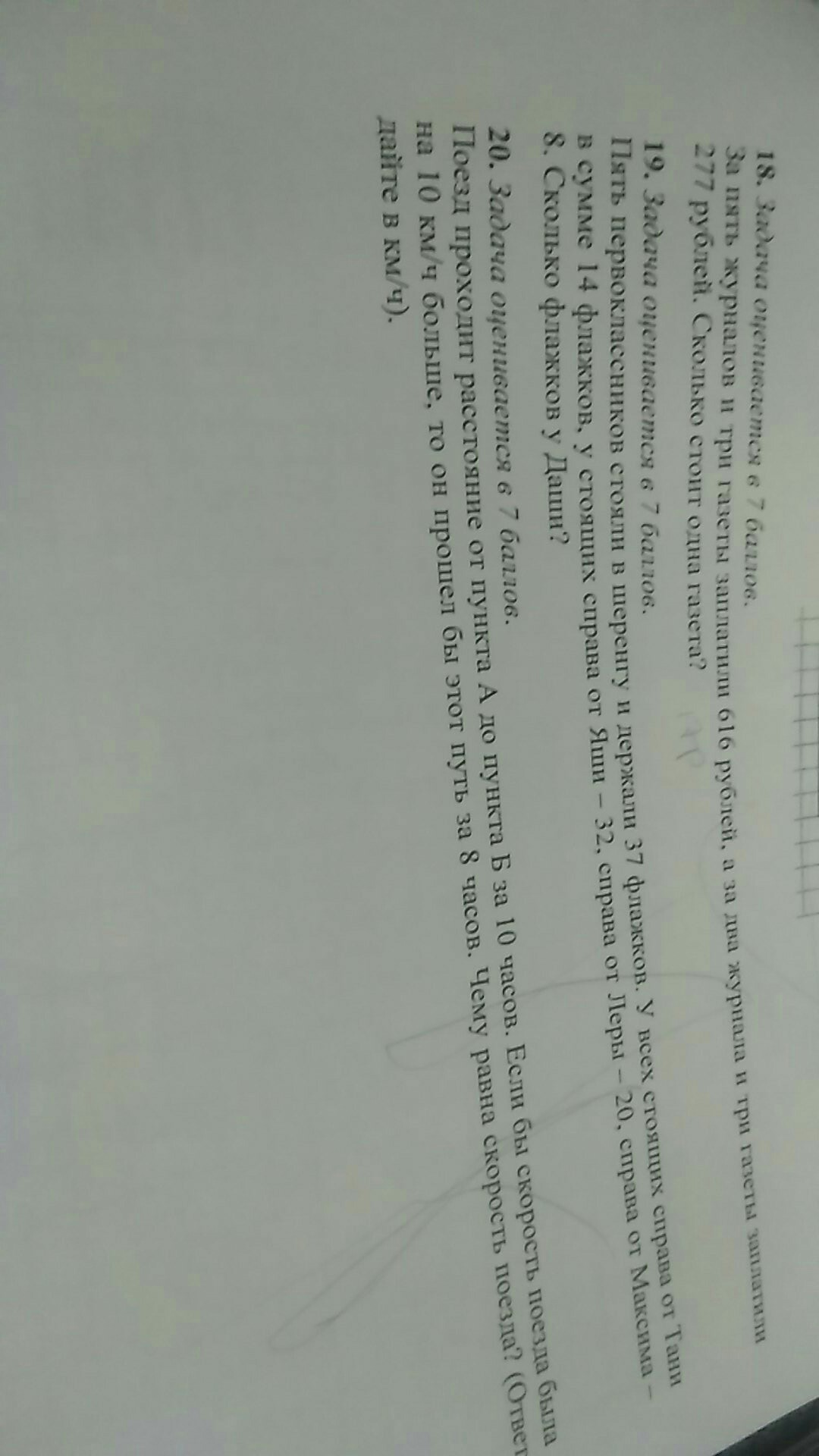 короче, в 19 там просто расставляешь людей по убыванию изходя из условия. Получчается Яша-Лера-Таня-Макс-Даша. дальше вычитаешь из 37-32 (из общего числа флажков 32,что справа от Яши), итого у Яши 5. По аналогии у Леры (32 Яшины - 20 справа от нее=12), у Тани (20-14=7), у Макса (14-8=6) и у Даши 8 справа от Макса - 6 которые Макса = 2