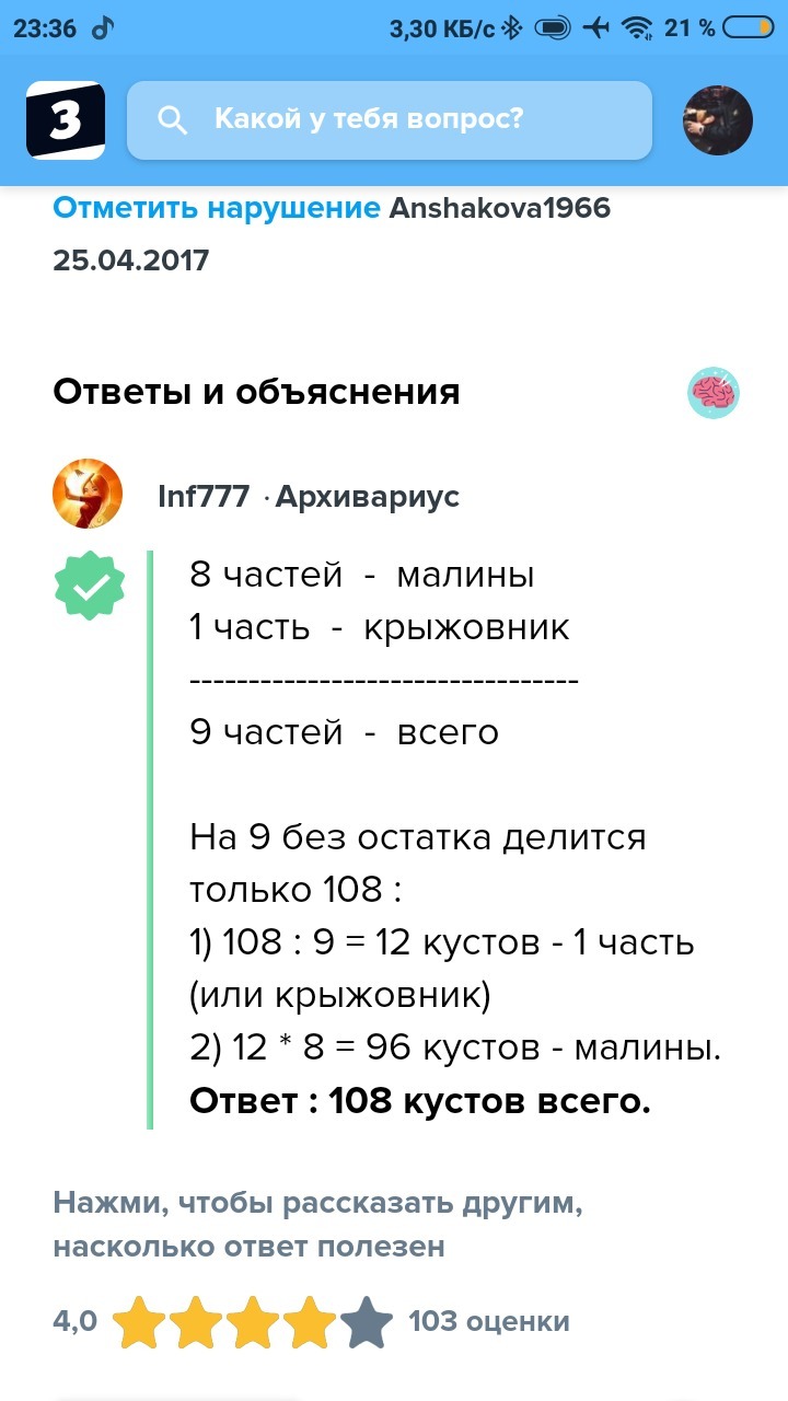 Задача кустов малины в саду в восеь раз больше чем крыжовника Садовник решил посчитать все кусты в саду сначала у него получилось 106 кустов затем 110 а в третий раз 108 известно что один раз он посчитал верно Сколько всего кустов в саду