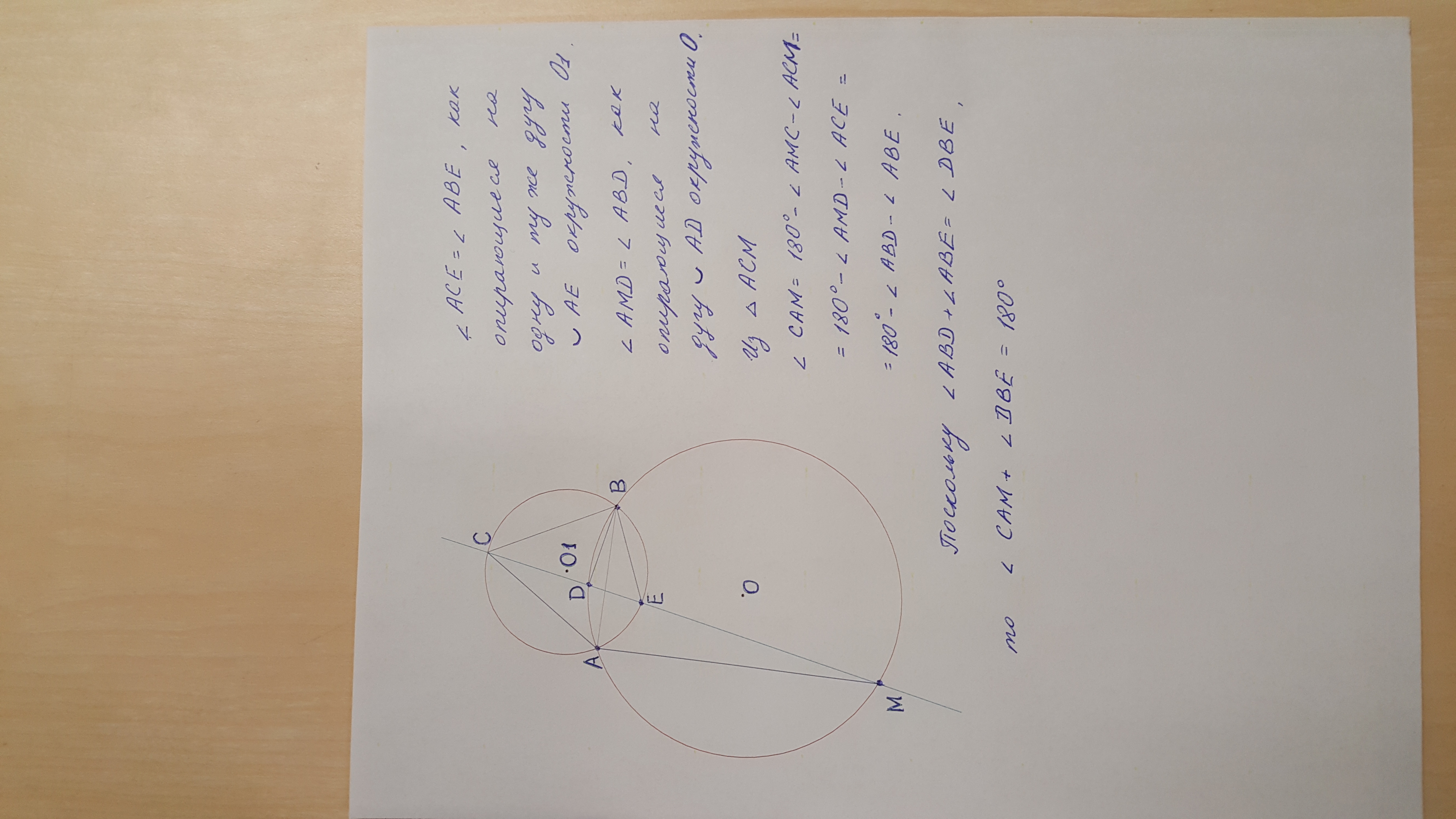 Две окружности пересекаются в точках А и В. точки А и В лежат по разные стороны от прямой l, которая пересекает окружности соответственно в точках C, D, E, M. Доказать, что сумма углов DBE и CAM равна 180