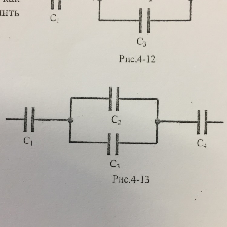 Три конденсатора с емкостями С1=1 мкФ, С2=1 мкФ, С3=2, мкФ С4=5 мкФ соединены по схеме, изображённой на рисунке 4-13. Какова их общая емкость?