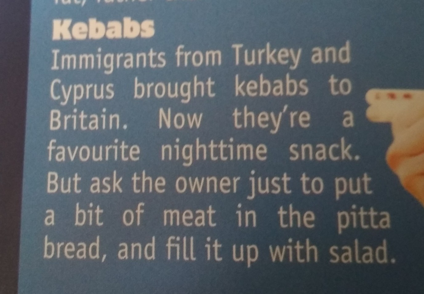 В Британию привезли шашлыки из Турции и Кипра. Теперь они - любимые ночные закуски. Но попросите владельца просто положить немного мяса в лаваш, и заполнить с салатом.