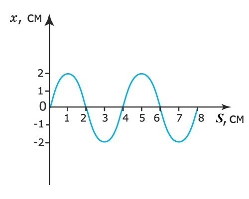 Определите длину волны, изображённой на рисунке. Чему равна амплитуда колебаний частиц в волне?