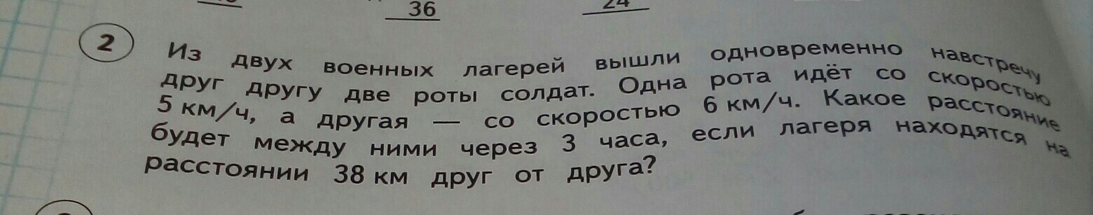 из двух военных лагерей вышли Одновременно навстречу друг другу две роты солдат 1 рота идет со скоростью 5 км ч а другой со скоростью 6 км ч Какое расстояние будет между ними через 3 часа если лагеря находится на расстоянии 38 км друг от друга