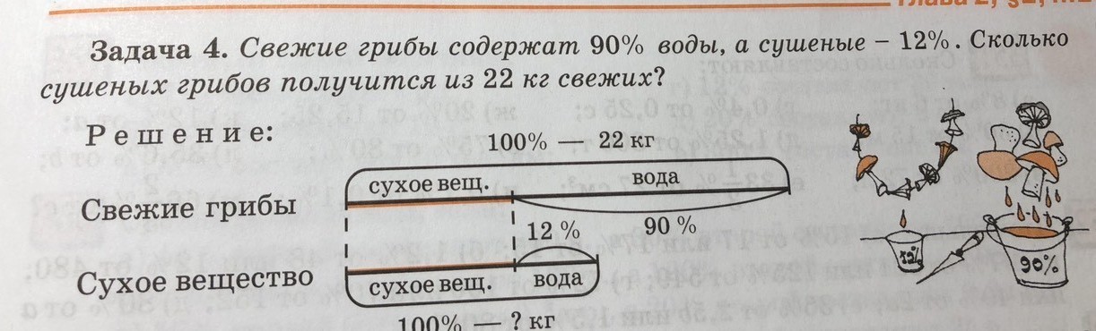 Составим пропорцию для вычисления сухого вещества в свежих грибах. Поскольку в грибах 90% воды, значит сухого вещества там 100 - 90 = 10%