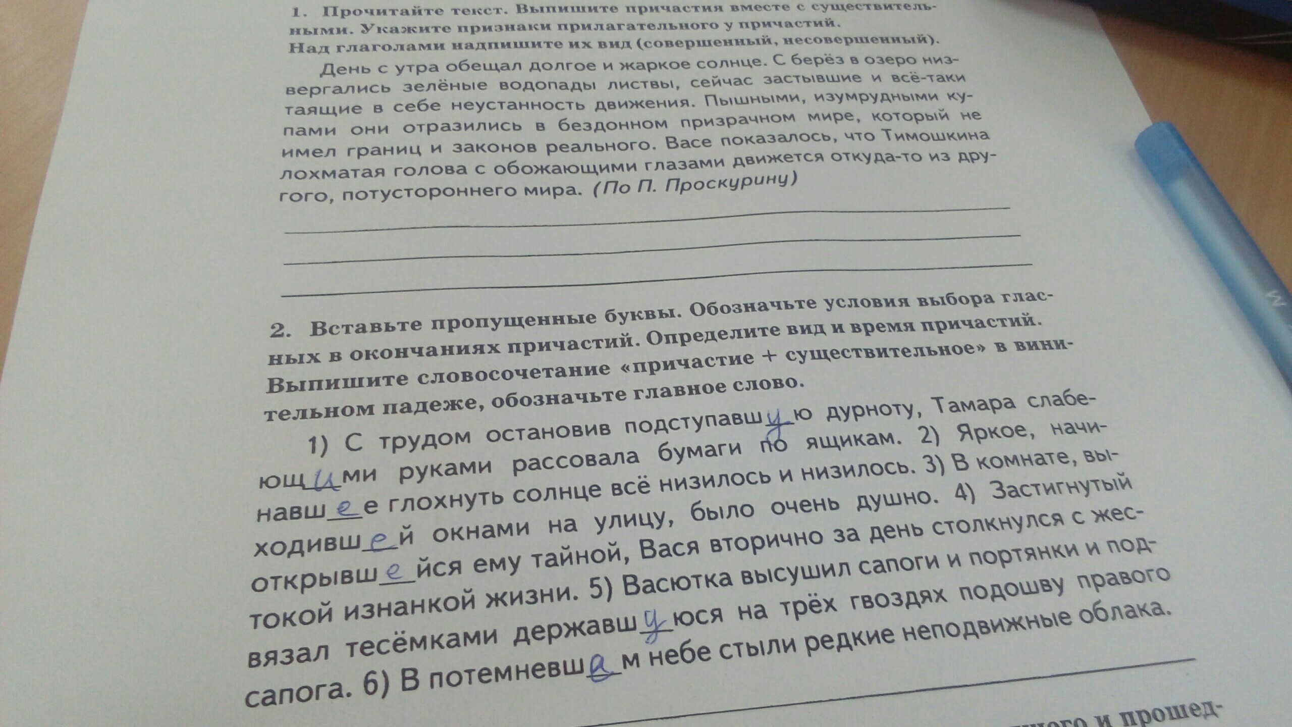 2) Яркое,начинавшее(И.п.,окончание-ЕЕ,действ.,причастие прош.времени) глохнуть солнце всё низилось и низилось. 3) В комнате, выходившей(П.п.,окончание-ЕЙ,действ.,причастие прош.времени) окнами на улицу,было очень душно. 4) Застигнутый(страдат.прич., прош.вр) открывшейся (Т.п.,окончание-ЕЙ,действ.,причастие прош.времени) ему тайной,Вася вторично за день столкнулся с жестокой изнанкой жизни. 5)Васютка высушил сапоги и портянки и подвязал тесёмками державшуюся(В.п.,окончание-УЮ,действ.,причастие прош.времени) на трёх гвоздях подошву правого сапога. 6) В потемневшем(П.п.,окончание-ЕМ,действ.,причастие прош.времени) небе стыли редкие неподвижные облака.