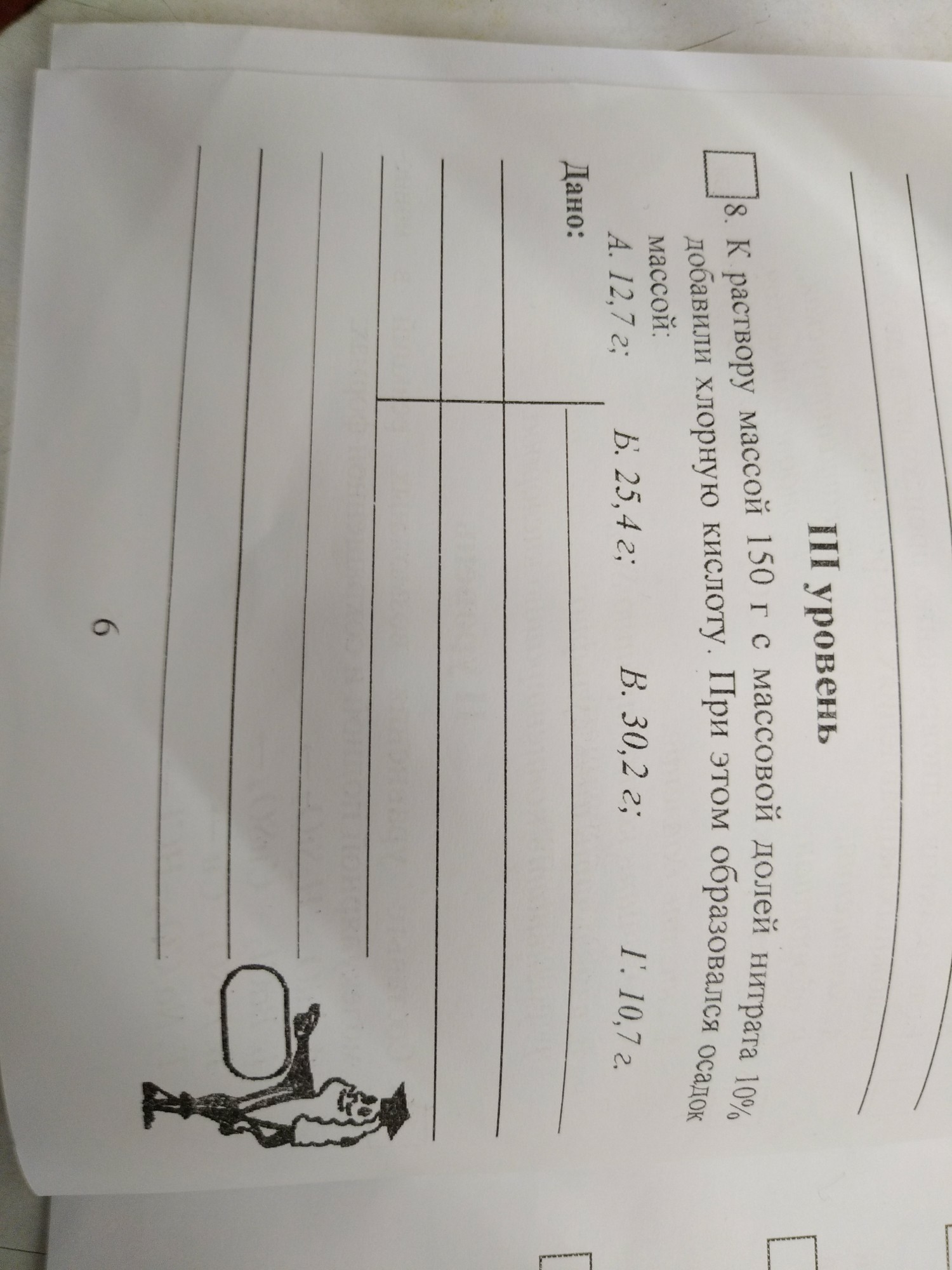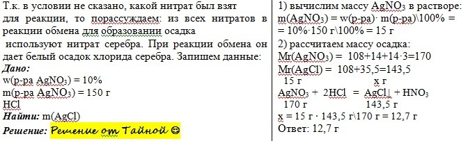 Дам много баллов! К раствору массой 150 г с массовой долей нитрата 10% добавили хлорную кислоту . При этом образовался осадок массой: а)12.7г б)25.4г в)30.2г г)10.7г