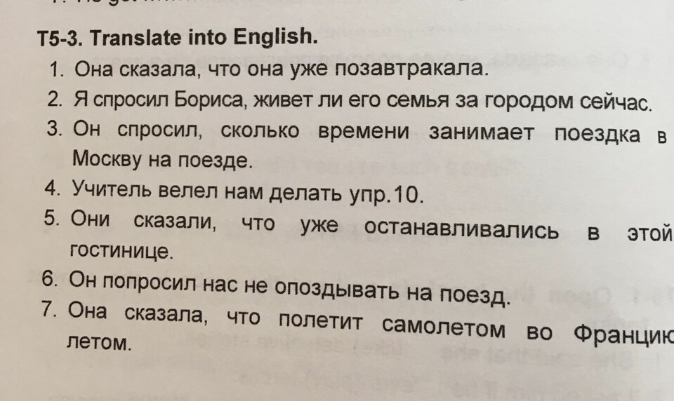 She said she already had breakfast. G. I asked Boris if his family lives outside the city now. Z. He asked how long a trip to Moscow by train 4 took, the teacher told us to do an exercise. ten . 5, they said that they already stopped at this hotel. He asked us not to be late for the train. 7. She said she would fly by plane to France