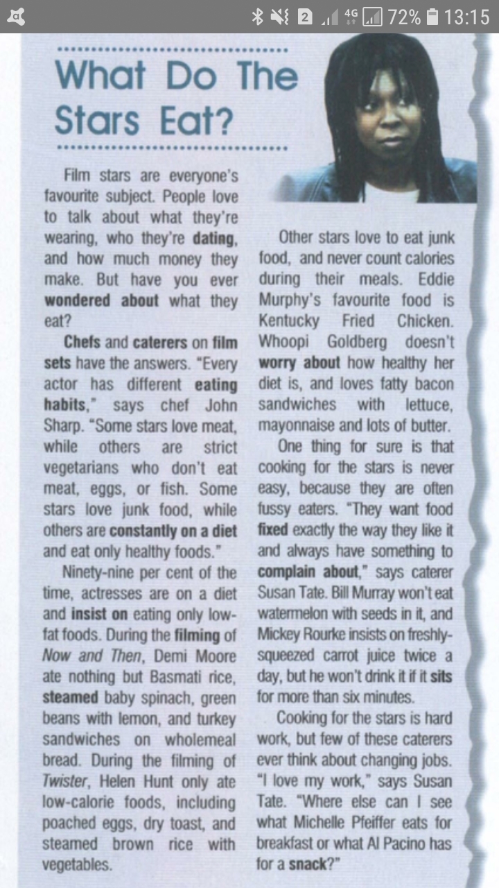 Звезды кино являются излюбленной темой каждого. Люди любят говорить о том, что они одеты, кто они знакомств и сколько денег они делают. Но вы когда-нибудь задумывались о том, что они едят? Повара и общепита на фильм наборы имеют ответы. «Каждый актер имеет разные предпочтения в еде», говорит шеф-повар Джон Шарп. «Некоторые звезды любят мясо, в то время как другие являются строгие вегетарианцы, которые не едят мясо, яйца или рыба. Некоторые звезды любят нездоровую пищу, в то время как другие постоянно на диете и есть только здоровую пищу». Девяносто девять процентов времени, актрисы на диете и настаивать на еде только нежирные продукты. Во время съемок сейчас и тогда, когда Деми Мур не ел ничего, кроме басмати, вареный шпинат, зеленая фасоль с лимоном и Турция бутерброды на хлеб из непросеянной муки. Во время съемок торнадо, Хелен Хант ели только низкокалорийные продукты, включая яйца, сухой тост и вареный коричневый рис с овощами. Другие звезды с удовольствием едят нездоровую пищу. Эдди Мерфи любимая еда — Kentucky Fried Chicken. Вупи Голдберг любит жирные беконом бутерброды с салатом, майонезом и большим количеством сливочного масла. Одна вещь, это точно является то, что приготовление пищи для звезд никогда не легко, потому что они часто суетливый едок. «Они хотят пищи фиксированной так им это нравится и alwa ys есть что-то жаловаться,» говорит провизии Сьюзен Тейт. Билл Мюррей не есть арбуз с семенами в нем и Микки Рурк настаивает на Свежевыжатый морковный сок два раза в день, но он не будет пить его, если он сидит более шести минут. Приготовление пищи для звезд это тяжелая работа, но повара не хотят менять свою работу. «Я люблю свою работу»,-говорит Сьюзан Тейт. «Где еще можно узнать что Мишель Пфайффер ест на завтрак или то, что Аль Пачино имеет закусить?»