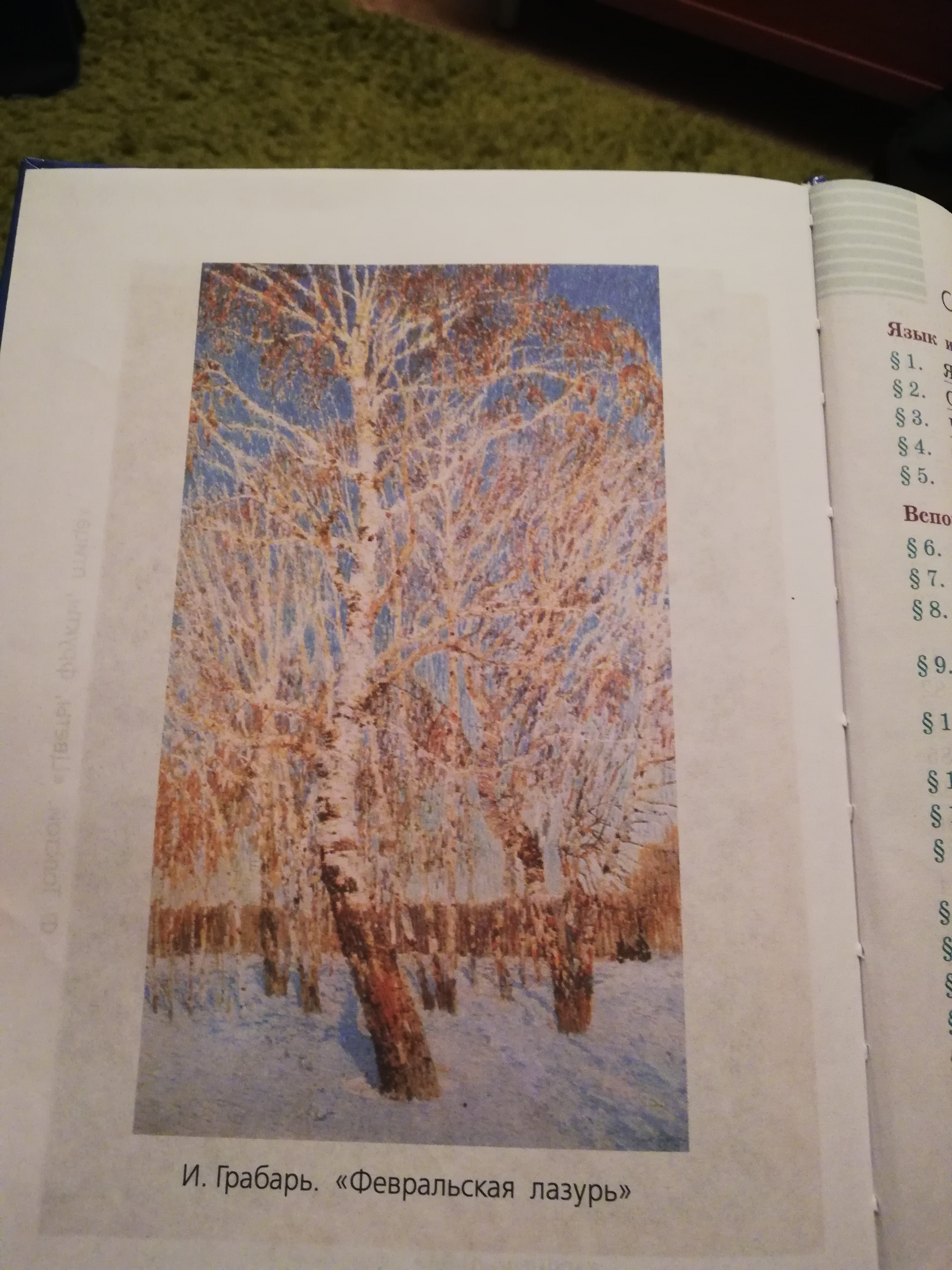 Удивительную картину нам передал Грабарь на своем полотне, которое носит поэтичное название - «Февральская лазурь». На передний план вынесена береза, которая покрыта тонким слоем инея. Он переливается, блестит, поэтому кажется, что дерево обзавелось янтарными бусами. Позади мы видим березки, которые ни в чем не уступают своей подружке, которая выскользнула вперед. Они показывают, что они тоже достойны внимания, так как их наряды не менее роскошны. Все березы изображены на фоне белоснежного покрывала, которое соткано самой старухой-зимой. Она не торопится его прибирать, словно желая немного задержаться.