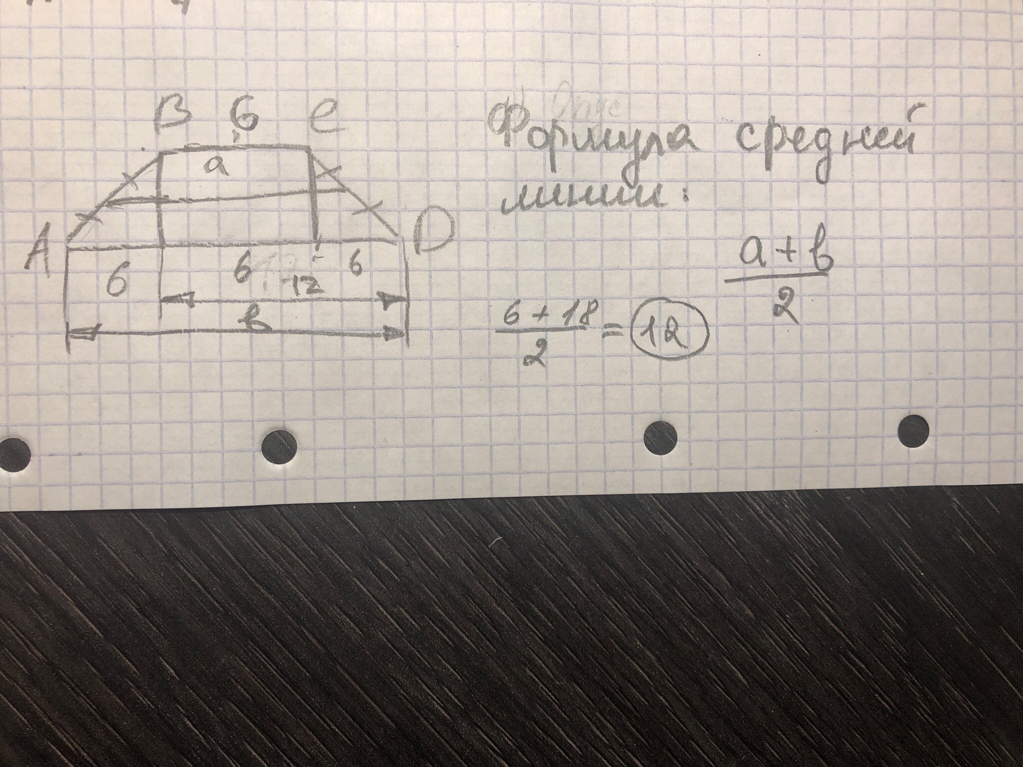 2) Видно, что если сделать то же действие с другим углом, то средний отрезок большего основания равен 6 и при этом образовывает прямоугольник с верхним основанием. Тогда верхнее основание тоже равно 6