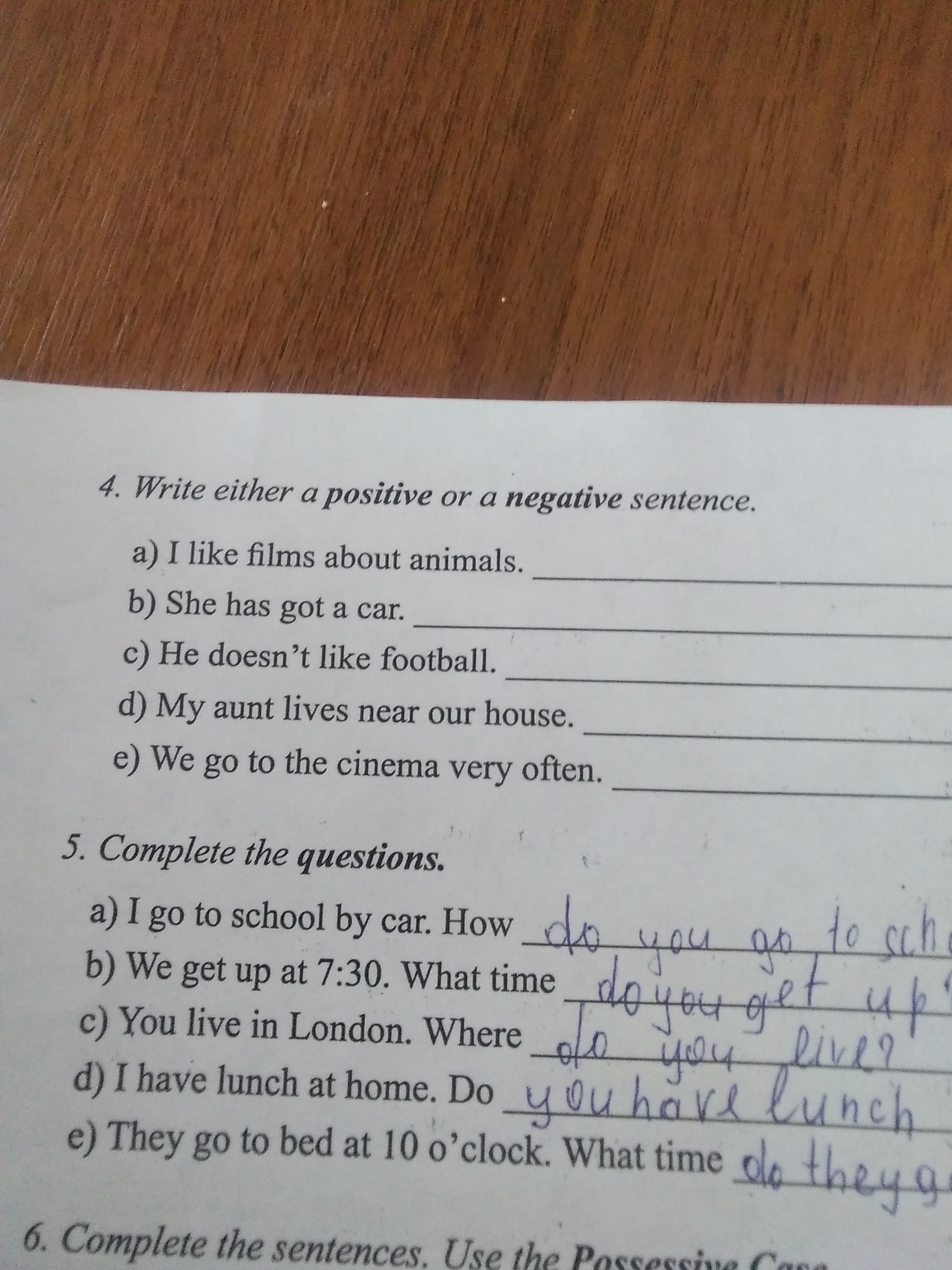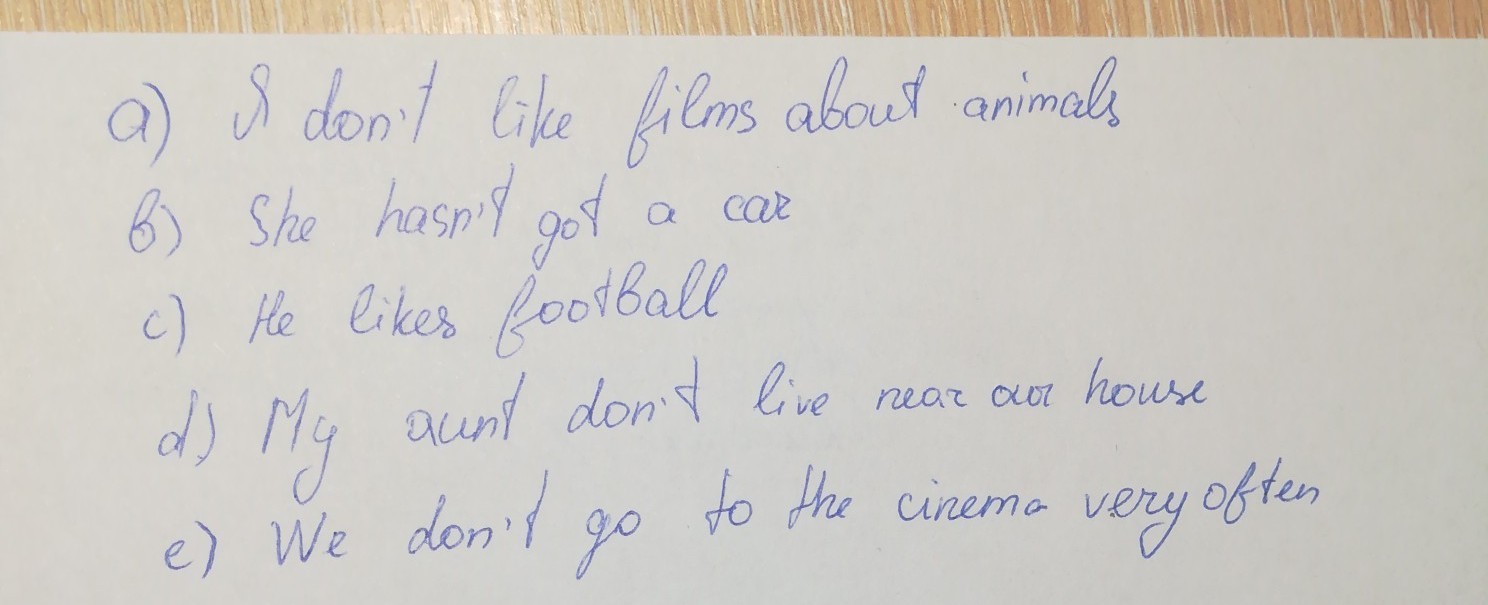 A) I do not like films about animals. B) She has not got a car. C) He likes football. D) My aunt does not live near our house. E) We do not go to the cinema very often