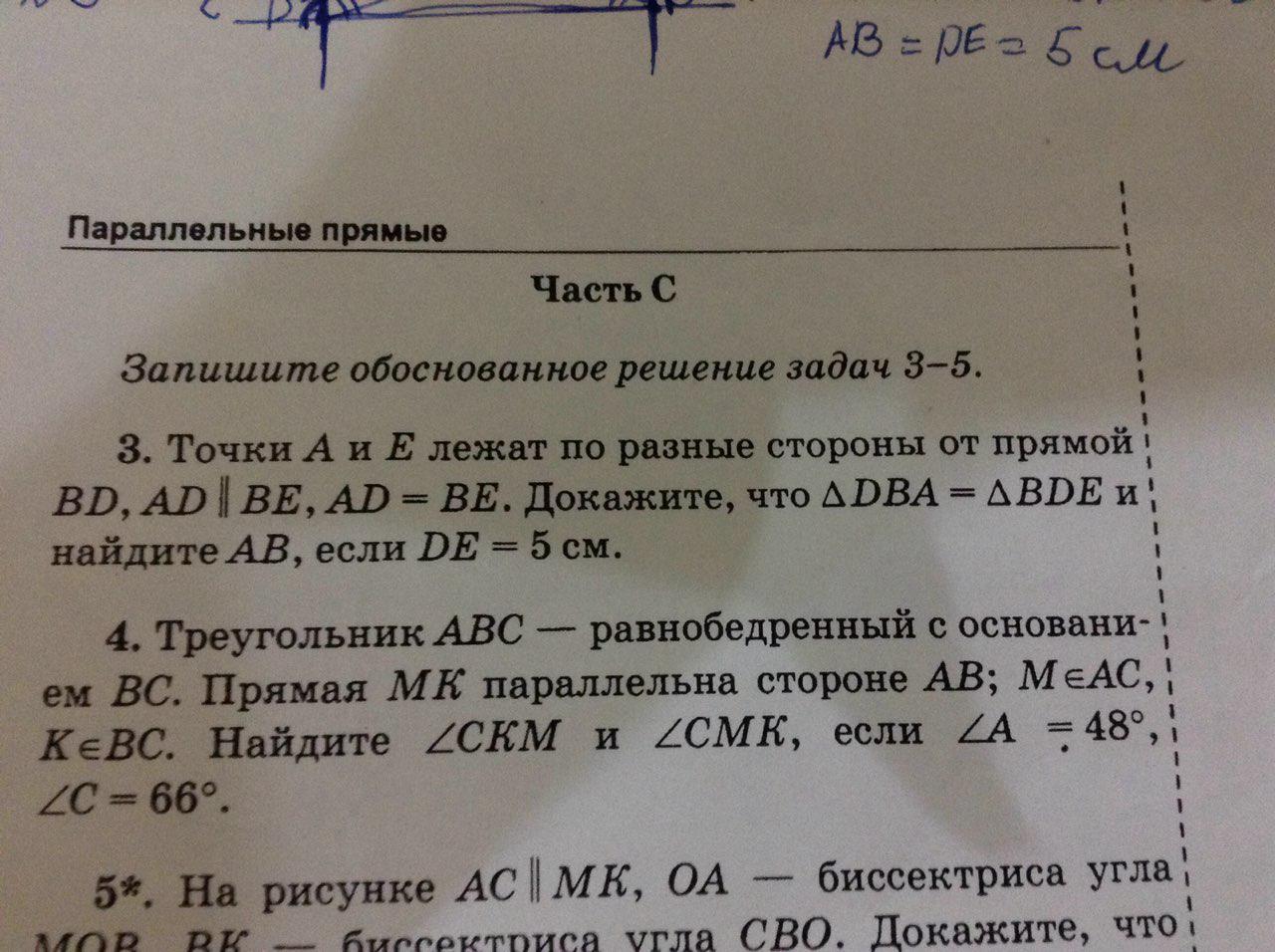 Задача №3. 1) AD ║ BE ⇒∠ADB = ∠DBE (накрест лежащие ⇒ а) ∠ADB = ∠DBE (по условию); б) BD - общая; AD = BE (по условию) ⇒ по двум сторонам и углу между ними ΔABD = ΔBDE ⇒ AB = DE = 5 см (против равных углов в равных треугольниках лежат равные стороны) Задача №4. 2) ΔCAB - равнобедренный, то AC = AB; ∠ABC = ACB = 66°; MK ║ AB ⇒ ∠MAB = ∠CMK = 48°; MKC = ABC = 66° (соответственные углы при MK ║ AB); Ответ: ∠CMK = 48°; ∠CKM = 66°;