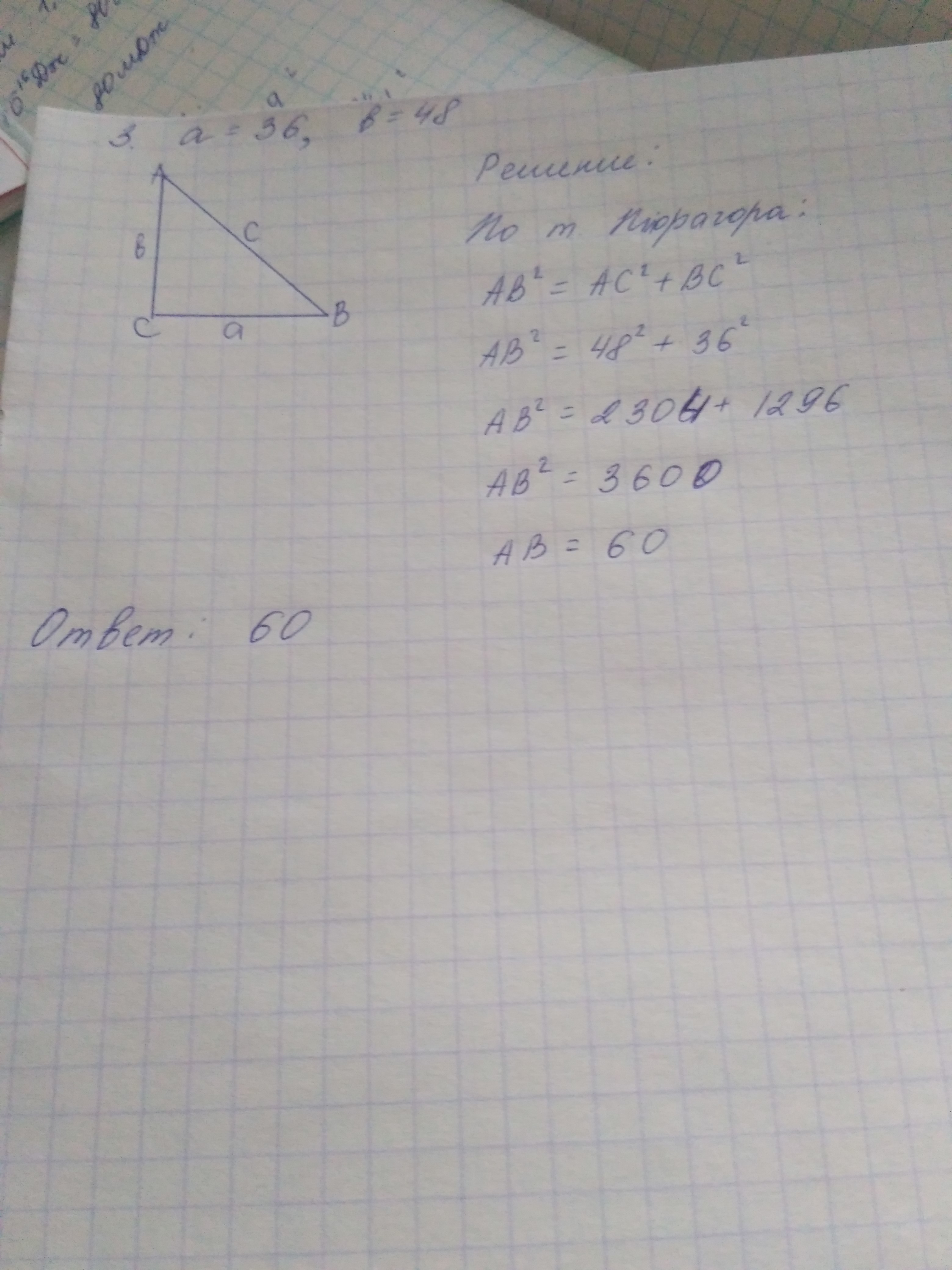 Решите прямоугольный треугольник, если 1)b=52 β=53°8' 2)c=89 α=25°59' 3)a=36 b=48 4)a=11 β=79°36'