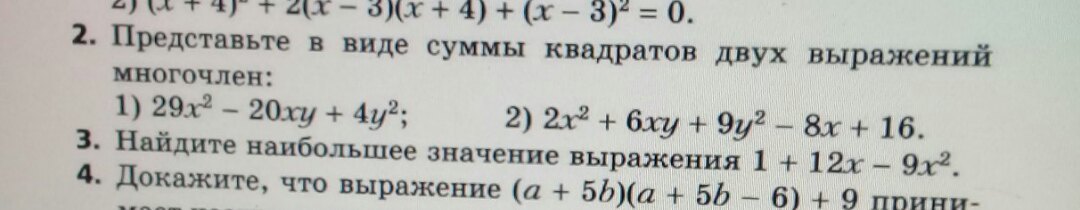 1)29 {x}^{2}  - 20xy + 4 {y}^{2}  =  \ 4  {x}^{2}  + (25 {x}^{2}  - 20xy + 4 {y}^{2} ) =  \ 4 {x}^{2}  +  {(5x - 2y})^{2}  \ 2)2 {x}^{2}  + 6xy + 9 {y}^{2}  - 8x + 16 = \   ({x}^{2}  + 6xy + 9 {y}^{2} ) + ( {x}^{2}   - 8x + 16) =  \  {(x + 3y)}^{2}  +  {(x - 4)}^{2}