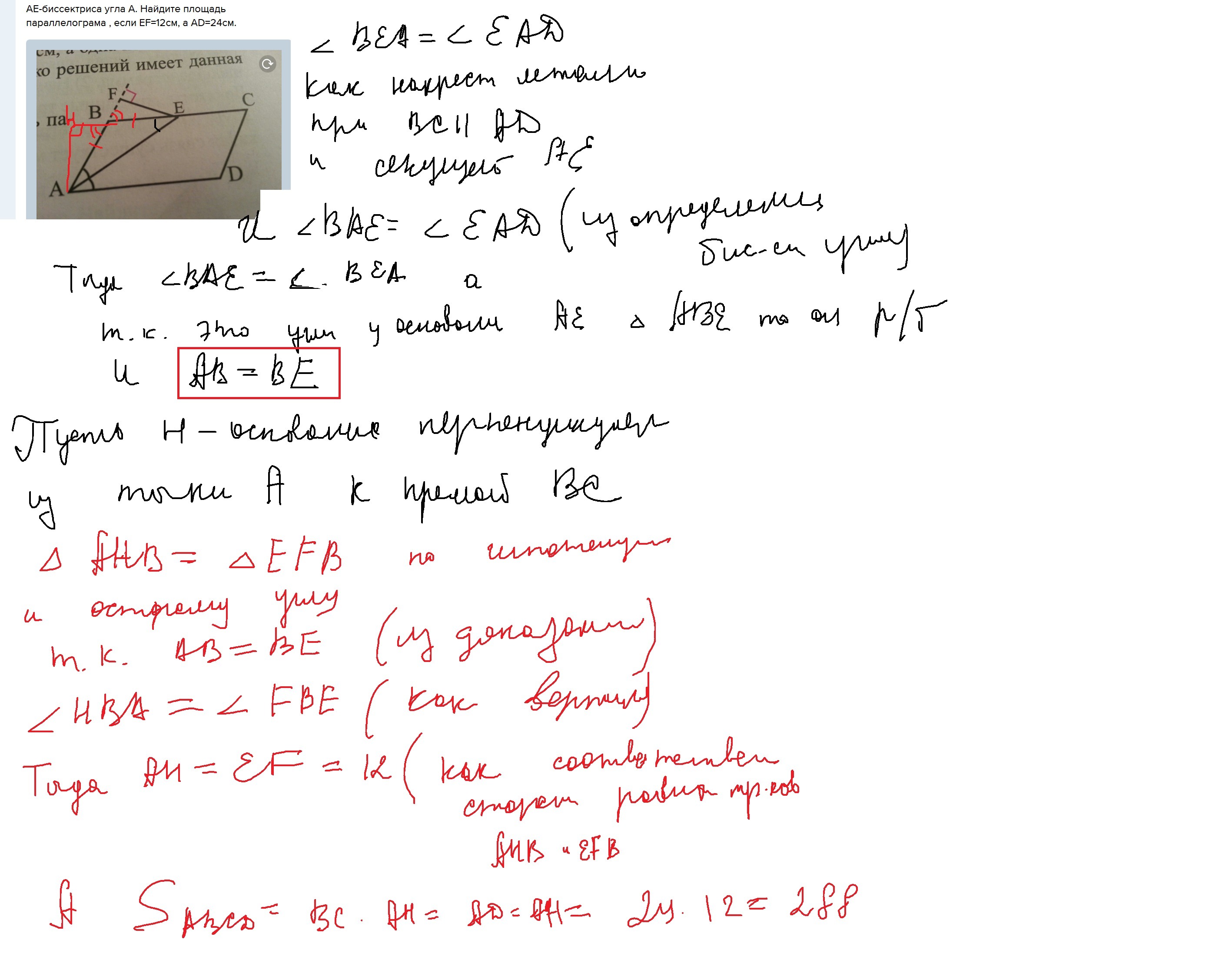AE-биссектриса угла А. Найдите площадь параллелограма , если EF=12см, а АD=24см.