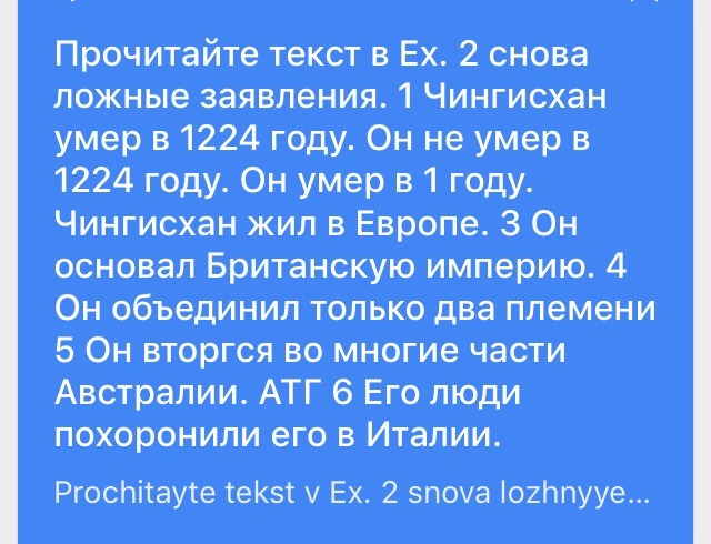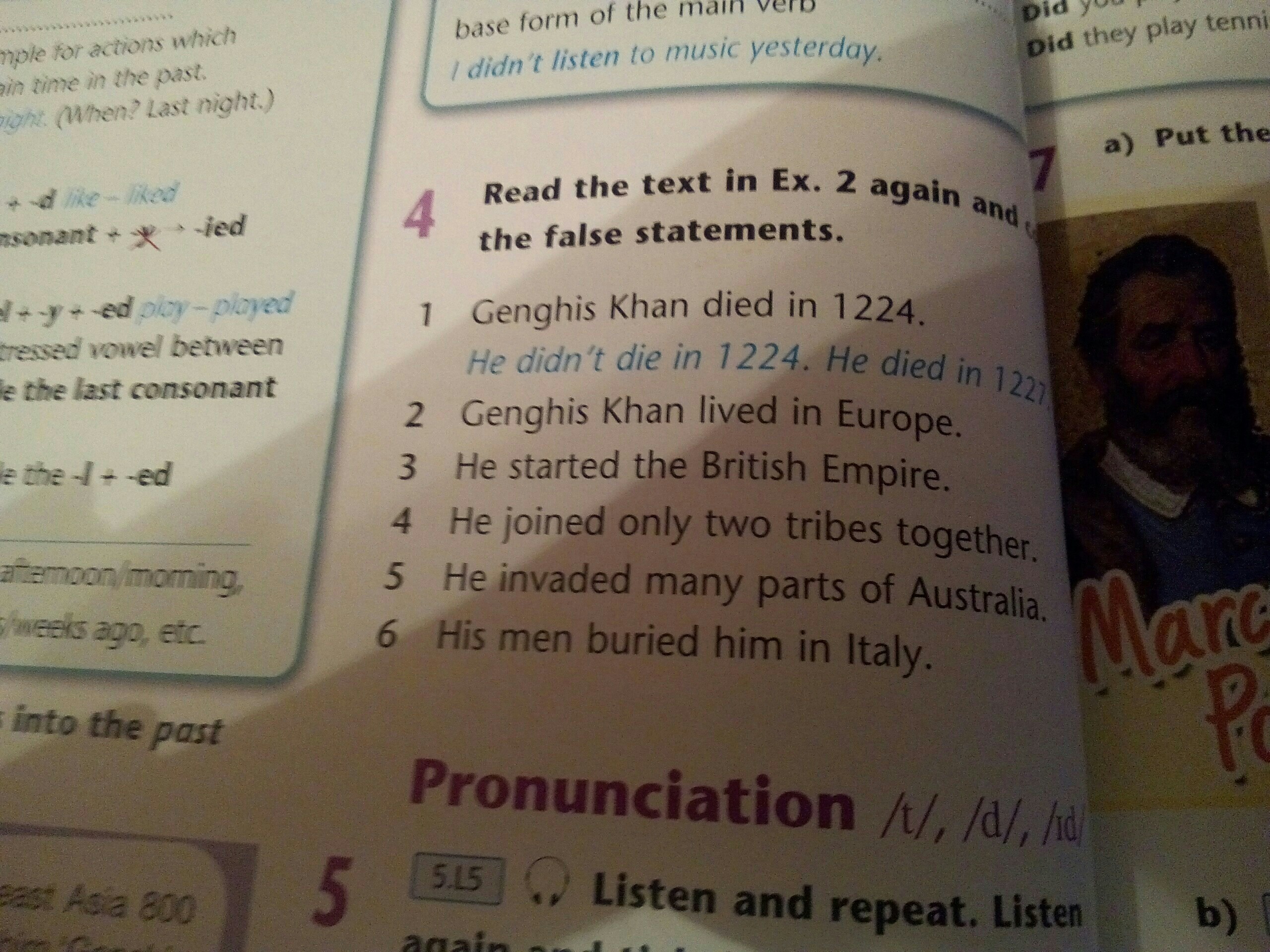 Прочитайте текст в Ex. 2 снова ложные заявления. 1 Чингисхан умер в 1224 году. Он не умер в 1224 году. Он умер в 1 году. Чингисхан жил в Европе. 3 Он основал Британскую империю. 4 Он объединил только два племени 5 Он вторгся во многие части Австралии. АТГ 6 Его люди похоронили его в Италии.