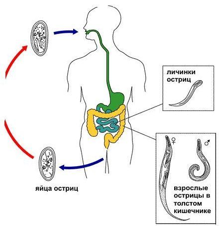 Попав в ротовую полость, личинки проникают в тонкий кишечник, где происходит развитие острицы и её дозревание еще 10–14 дней до того времени, когда они смогут оплодотворяться. С этого момента все этапы повторяются. Хорошо отображает острицу и ее жизненный цикл нижеприведенная схема.