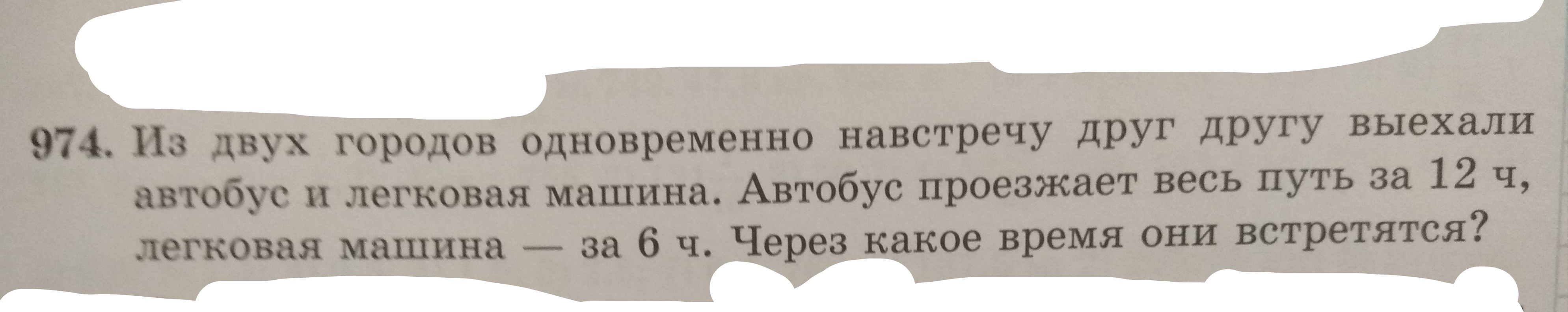 скорость автобуса 1/12 а автомобиля 1/6. раз одновременно то сумма их скоростей будет 1/12+1/6 = 3/12 = 1/4.