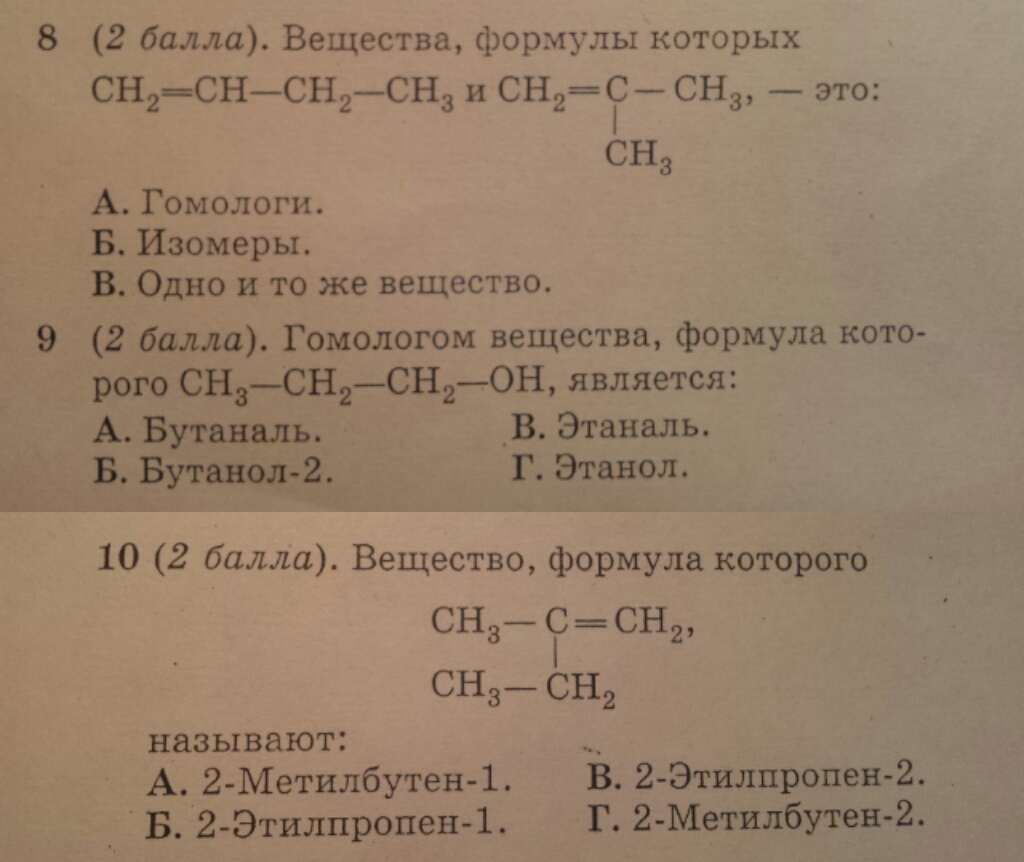 Во вложении 3 задания(с выбором ответа) на изомеры и гомологи