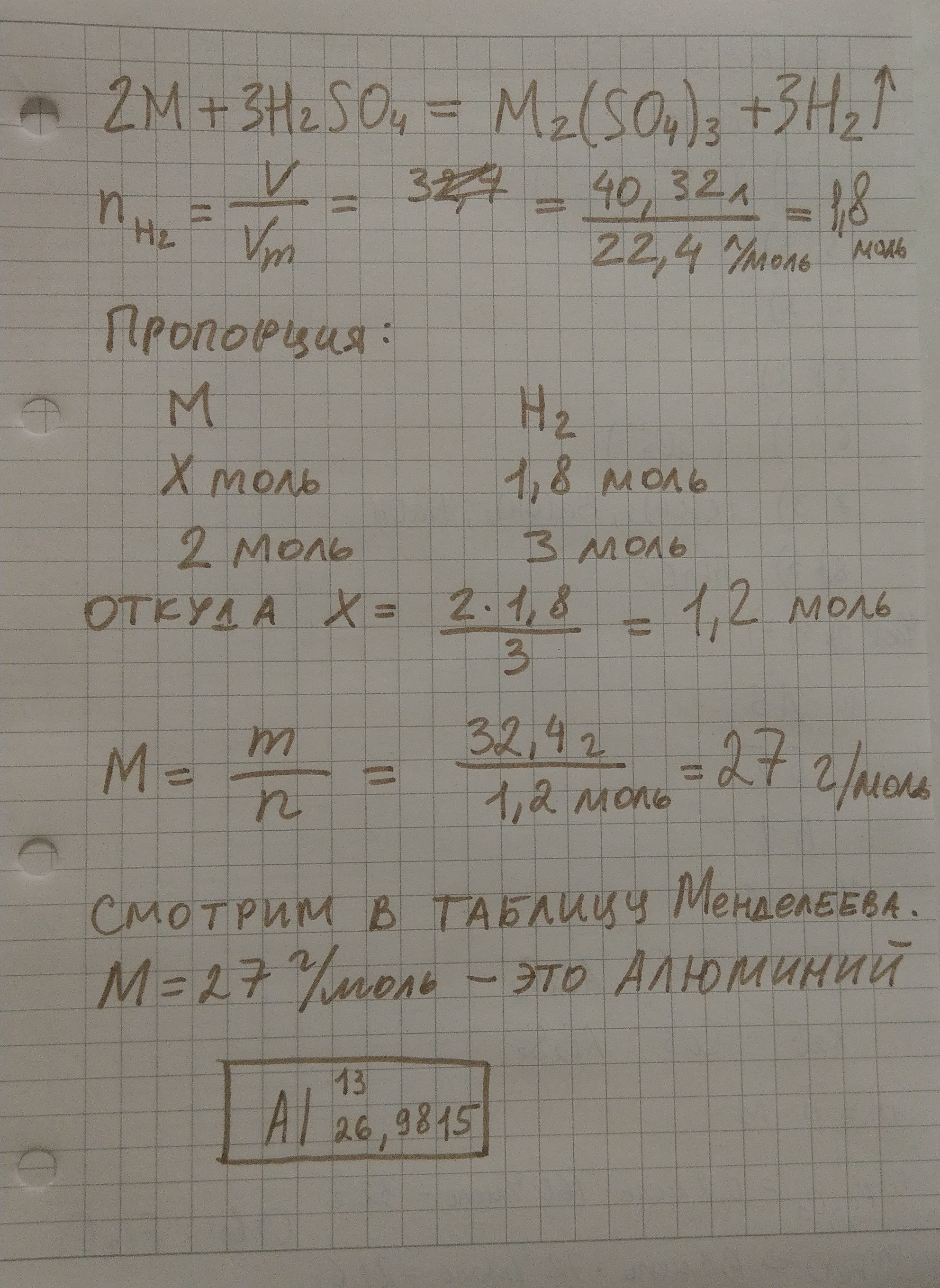 Трёхвалентный металл массой 32,4 г растворили с сульфатной кислотой. При этом выделился водород объёмом 40,32 л. Определите этот металл.