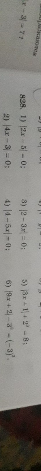 2) |4x - 3| = 0 ⇒ 4x - 3 = 0; 4x = 3; x = 3/4; 4) |4 - 5x| = 0 ⇒ 4 - 5x = 0; - 5x = - 4; x = 4/5; 6) | 9x + 2| - 3³ = (-3)³ ⇒ |9x + 2| = 27 - 27 = 0 ⇒ |9x + 2| = 0; ⇒ 9x + 2 = 0 ⇒ 9x = -2 ⇒ x = - 2/9