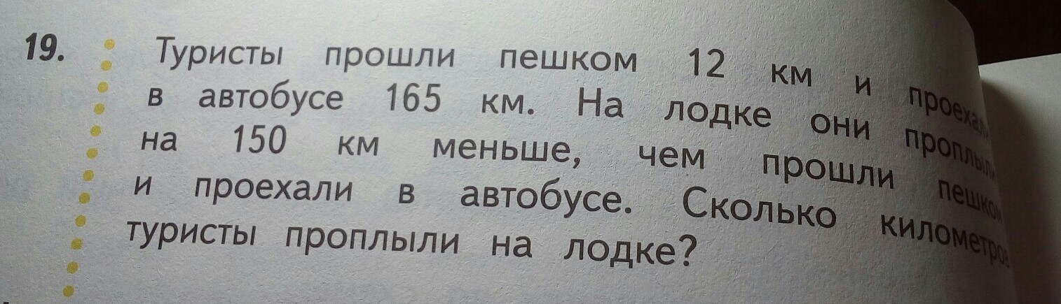 Туристы прошли пешком 12 км и проехали в автобусе 165 км. На лодке они проплыли на 150 км меньше, чем прошли пешком и проехали в автобусе. Сколько километров туристы проплыли на лодке?